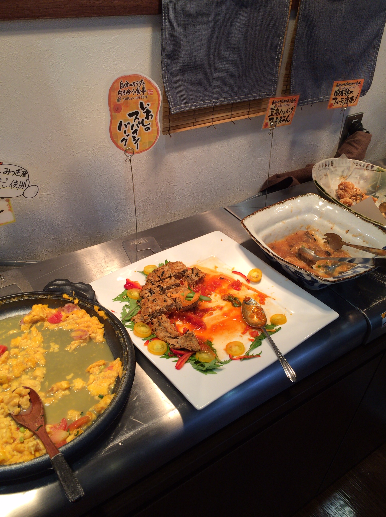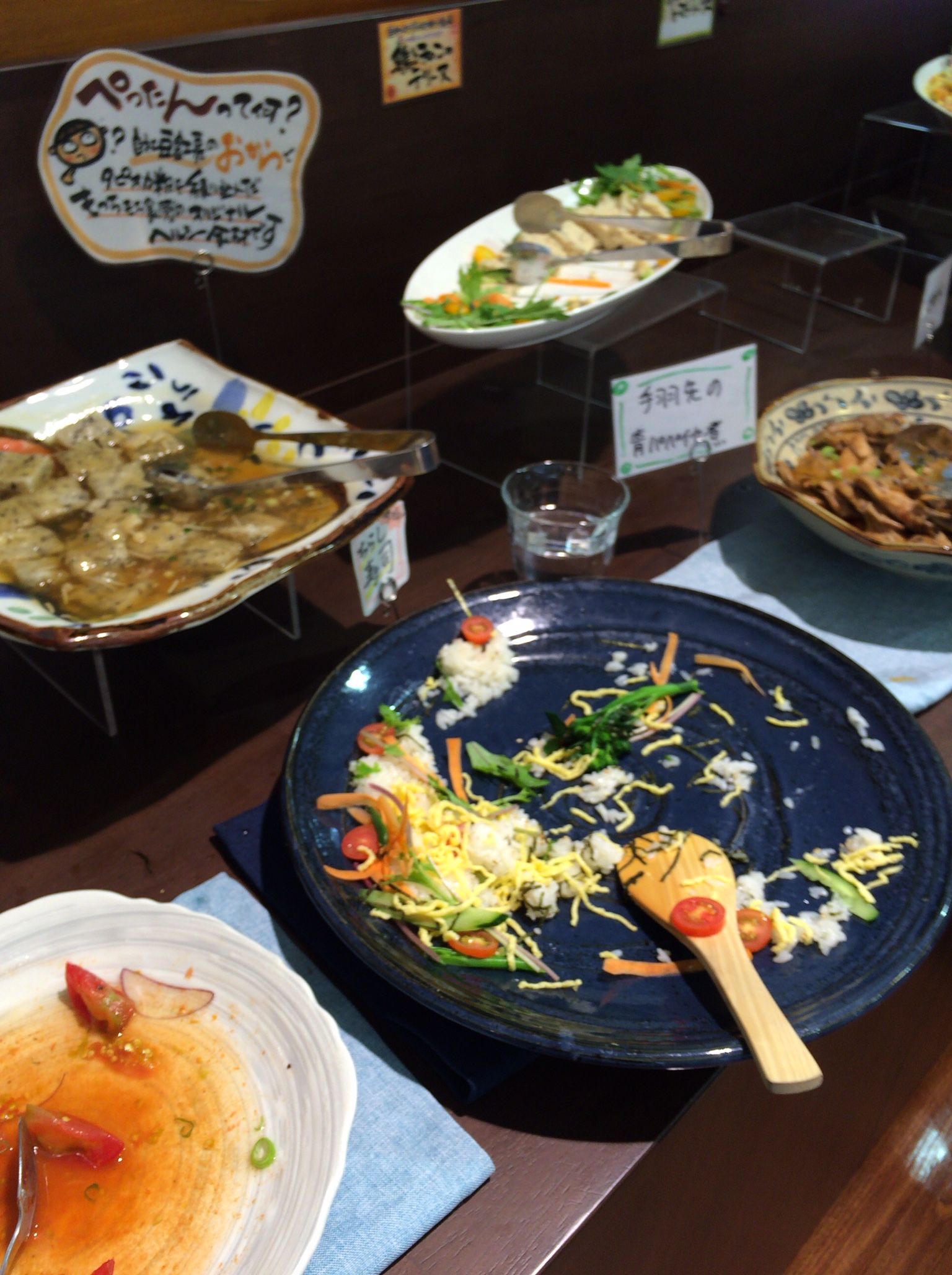 レストランは、惣菜や地元野菜のサラダ、デザートが並んでいます。